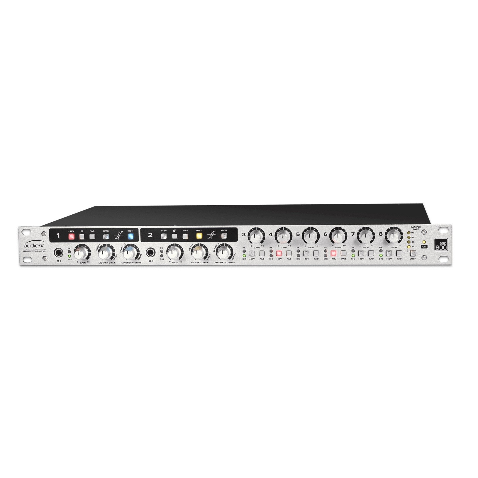 הפריאמפים ביחידה מבוססים על הקונסולות של החברה – אותו מעגל שיש ב-ASP8024-HE. אלה פריאמפים עם רצפת רעש נמוכה ודיסטורשן הרמוני עדין ומספק מאוד. ב-2 הפריאמפים הראשונים של היחידה תוכלו לבחור להוסיף צבע ורוויה עם 2 מעגלים שונים – HMX ו-Iron – אחד מכוון לסאונד מנורתי של שנות ה-60 והשני לרוויה מ-Transformers בריטיים סטייל שנות ה-70.